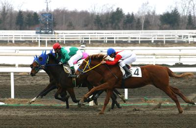 国内で最も早い新馬の能力検査がスタート! 2005.03.17 2005ホッカイドウ競馬の能力検査がスタートしました。 積雪の残る門別競馬場で、元気あふれる新馬達が 白い息を吐きながら疾走しましたが、勝負服をまとい 若駒を駆る騎手達は寒さに凍えていたようです。 本年初回となる3月17日の能力検査には11頭が エントリーされ、全馬が合格しました。 <写真は能力検査の様子 馬場の内側にはまだ雪が残る>