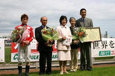 コスモバルク号国際GⅠ優勝報告会実施 2006.06.01 6月1日札幌競馬場でコスモバルク号の国際GⅠ優勝報告会がおこなわれ、これまでコスモバルク号が北海道民に大きな感動と明日に立ち向かう夢と希望を与えてくれたことに感謝し高橋はるみ北海道知事より馬主岡田美佐子様に感謝状が贈呈されました。 なお、ビッグレッドファーム代表岡田美佐子様からコスモバルク号が勝ち得ました賞金の一部(金500万円)を、北海道の社会福祉に役立てていただきたいと寄附の申し出があり、同報告会で高橋はるみ北海道知事へ寄附目録の贈呈が行われました。