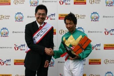表彰式ではダービーWeekを記念しフサイチネット会員のプレゼンターからエルメスのネクタイとドンペリが手渡された。