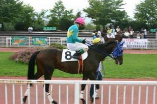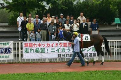 ニイカップギレン デビュー戦4着! 2006.08.29 ホッカイドウ競馬を応援しようと新冠町の町議有志が組合馬主として購入したニイカップギレンが8月29日、旭川競馬場でデビューしました。 レースは、山口騎手鞍上で6頭立ての4着でゴール。 この日は、地元の新冠町から関係者34名が来場。パドックに「走れ希望!ニイカップギレン号」の横断幕を張り、声援をおくっていました。