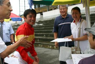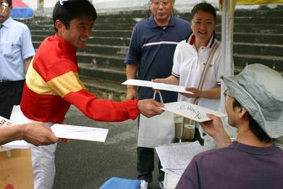 第2回ジョッキーシート プレゼンターは井上俊彦騎手! 2006.08.30 8月29日、2回目の『旭川競馬場ジョッキーシート』が行われ、ラッキーシートのプレゼンターを井上俊彦騎手が務めました。 井上騎手は当選者に1人1人サイン色紙や景品をプレゼントし、受け取ったファンは大感激でした。