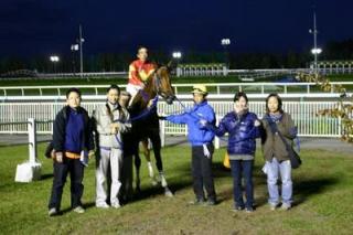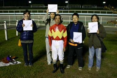 第4回 優勝馬との写真撮影体験 2006.09.21 毎週木曜日に実施している「優勝馬との写真撮影体験」が9月21日、旭川競馬場で行われ、一般ファン四名が第7レース終了後に優勝馬との写真撮影を体験しました。 写真撮影に参加したのは、旭川市内の石黒美咲さん、千葉陽子さん、山本愛さん、成田桃子さんの四人で、四人は会社の同僚。 四人はウィナーズサークルで第7レースの優勝馬トウショウソング号、原調教師、坂下騎手らと一緒に口取り写真撮影に参加しました。 写真撮影終了後には、坂下騎手から直接サインをもらい大喜びでした。
