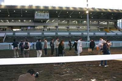 ゴール板付近から、重賞ファンファーレと行進曲が場内に流れるなか、走路内に入ったファンは思い思いに歩いたり、走ったり、ゴール板前で記念写真を撮影したり、帰りには砂をビニール袋に入れ持ち帰る人などもいて、普段入ることの出来ないエリアを満喫していました。