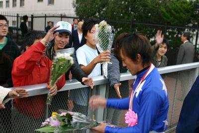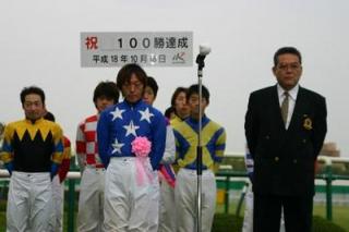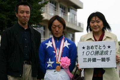 三井健一騎手 100勝達成表彰式! 2006.10.19 10月18日、札幌競馬第7レースで100勝を達成した三井健一騎手(高橋司厩舎)の表彰式が、10月19日、札幌競馬場ウィナーズサークルで行われ、かけつけた多くのファンや関係者の祝福を受けました。 また、表彰式終了後には、三井騎手から集まったファンに花束やサイン色紙がプレゼントされました。 なお、口取り写真では岩橋勇二騎手がプラカード持ちを務めてくれました。