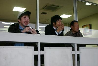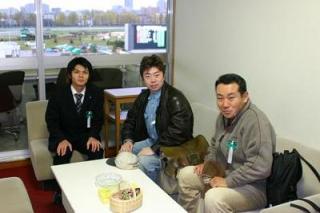 馬主室への招待イベント 2006.11.07 11月7日、札幌競馬場で、一般ファンを対象とした『馬主室への招待イベント』が行われ、3名が第5レース・第6レースを馬主席から観戦しました。 参加者は、札幌市の石川千尋さん、岡本雅臣さん、真狩村の植田輝彦さん。 3名は3階の馬主室へ入場し、馬主気分をあじわいながら馬券を握りしめレースを観戦し、とても感激していました。