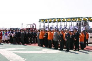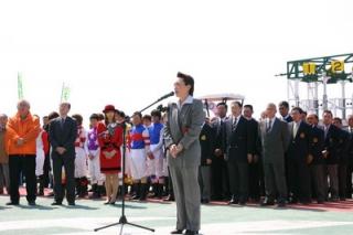 開幕式では、山本副知事、橋本参議院議員、酒井新ひだか町長が挨拶を行った後、今年新しく調教師として開業した岡島調教師と田中調教師に一般ファンから花束が贈られました。
