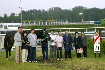 第7回 優勝馬との写真撮影体験! 2007.06.07 6月7日、旭川競馬場で、第7回「優勝馬との写真撮影体験」が行われ、一般ファン4名が写真撮影を行いました。 参加したのは、神奈川県の米内雄一さん、東京都の谷本竜太さん、西島秀美さん・和子さんの4名。 4名は、第7レースの優勝馬カミヒコーキ、若松調教師、佐々木国明騎手らと口取り写真に参加し、撮影後にはサインをもらいました。 写真 上:関係者との口取り写真 下:佐々木国明騎手と記念撮影