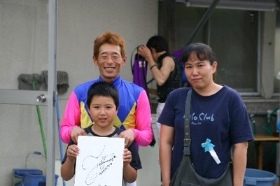 2名は実況放送室で古川アナウンサーと競馬ブックの高倉記者が担当したパドック解説と太田アナウンサーのレース実況を観戦し、また、検量室では服部茂史騎手・小平健二騎手からサインをもらい、記念撮影をしました。