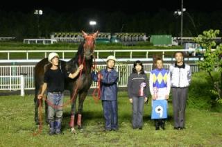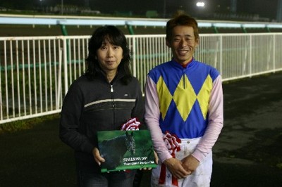 第13回目は「タップダンスシチー賞」で、旭川市のファンがプレゼンターを務め、優勝馬アドマイヤロマネの廣森調教師(馬主代理)、服部茂史騎手に記念品を贈呈しました。