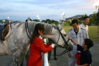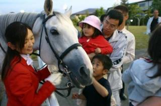 ヨシカツヒーロー号 ウィナーズサークルに登場! 2007.07.17 7月17日、ホッカイドウ競馬の誘導馬ヨシカツヒーロー号が、旭川競馬場のウィナーズサークルに登場し、ファンとふれ合い、場内を賑わせました! ヨシカツヒーロー号が現れると子供たちが駆けより、顔や体に触れ「かわいい!温かい!」などの歓声があがっていました! このふれあいコーナーは、8月中旬まで実施する予定です。 写真:ヨシカツヒーロー号に触れ、大喜び!