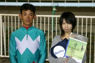 第23回 スタリオン競走表彰プレゼンター 2007.07.31 7月31日、旭川競馬場で「第23回 スタリオン競走表彰プレゼンター」が行われました。 第23回目は「アルカセット賞」で、札幌市のファンがプレゼンターを務め、優勝馬ブライトフェースの馬主 木谷様と齊藤正弘騎手にそれぞれ記念品を贈呈しました。 また、プレゼンターには、ダーレー・ジャパン株式会社から提供されたダーレーグッズが贈られました。 写真 上:馬主へ目録贈呈 中:関係者との記念撮影 下:ダーレーグッズを手に齊藤正弘騎手と記念撮影