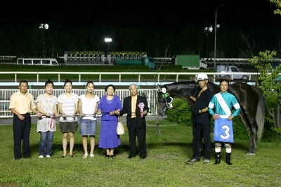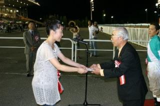 第27回 スタリオン競走表彰プレゼンター 2007.08.14 8月14日、旭川競馬場で「第27回 スタリオン競走表彰プレゼンター」が行われました。 第27回目は「アグネスデジタル賞」で、沼田町の祭りのPRで競馬場を訪れていたミスあんどんがプレゼンターを務め、優勝馬ジェイドファストの馬主 松平氏と川島雅人騎手にそれぞれ記念品を贈呈しました。 また、プレゼンターには、(有)ビッグレッドファームから提供された「種牡馬パンフレット」が贈られました。 写真 上:優勝馬ジェイドファストと口取り写真 中:馬主へ目録の贈呈 下:川島雅人騎手と記念撮影