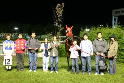 第17回 優勝馬との写真撮影体験! 2007.09.27 9月27日、旭川競馬場で、第17回「優勝馬との写真撮影体験」が行われ、ファン7名が写真撮影を行いました。 参加者は、第8レースの優勝馬クラマキシム、服部騎手らと口取り写真に参加しました。 撮影後には、服部騎手からサインをもらい記念撮影をしました。 写真 上:優勝馬クラマキシムとの口取り写真 下:服部騎手からサインをもらい記念撮影