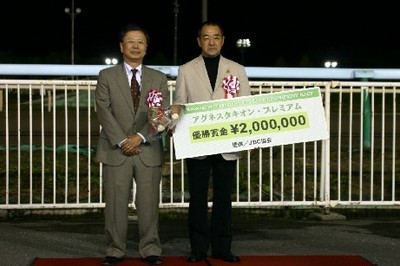 今回行われた『アグネスタキオン・プレミアムⅠ』では、山口騎手騎乗のビービーナエトルが勝利し、表彰式では、馬主(有)坂東牧場様が1着賞金200万円のパネルを受け取りました。
