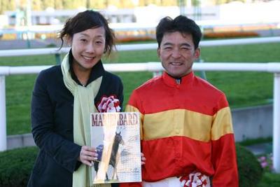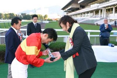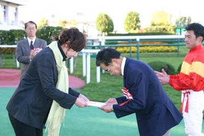 第44回 スタリオン競走表彰プレゼンター 2007.10.17 10月17日、旭川競馬場で本日2回目の「スタリオン競走表彰プレゼンター」が行われました。 第44回目は「マリエンバード賞」で、浦河町のファンがプレゼンターを務め、優勝馬マサノガーランドの黒川調教師(馬主代理)と井上騎手にそれぞれ記念品を贈呈しました。 また、プレゼンターには、(株)ジャパンレースホースエージェンシーから提供された『種牡馬パンフレット』が贈られました。 写真 上:黒川調教師へ目録贈呈 中:井上騎手へトロフィー贈呈 下:井上騎手との記念撮影