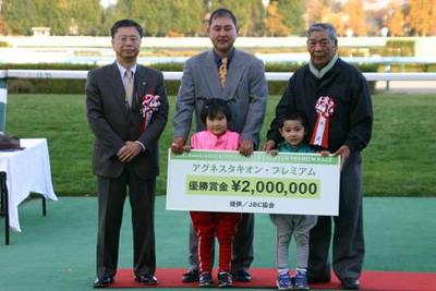 このレースでは、五十嵐騎手騎乗のモエレジンダイコが勝利し、表彰式では、馬主 中村様が1着賞金200万円のパネルを受け取りました。