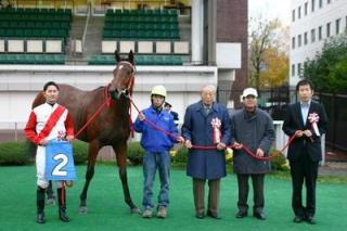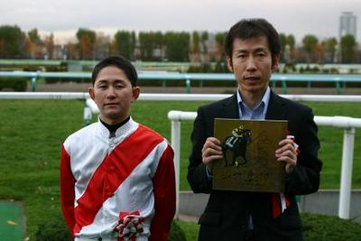 第45回 スタリオン競走表彰プレゼンター 2007.10.30 10月30日、札幌競馬場で「第45回 スタリオン競走表彰プレゼンター」が行われました。 第45回目は「リンカーン賞」で、札幌市のファンがプレゼンターを務め、優勝馬ブライズメイトの馬主様と佐々木騎手にそれぞれ記念品を贈呈しました。 また、プレゼンターには、 社台スタリオンステーションから提供された『種牡馬パンフレット』が贈られました。 写真 上:優勝馬ブライズメイトとの口取り写真 中:佐々木騎手へトロフィー贈呈 下:佐々木騎手と記念撮影