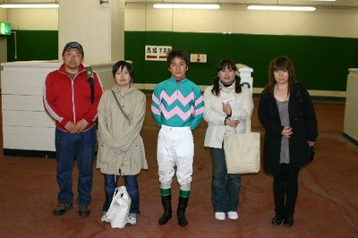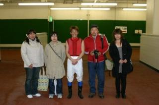 第4回 実況放送室・検量室観戦ツアー 2008.05.21 5月21日、札幌競馬場において、「第4回 実況放送室・検量室観戦ツアー」が行われ、ファン4名が見学しました。 今回参加したのは、札幌市から2名と小樽市、旭川市から各1名の計4名。 4名は実況放送室で古川アナウンサーと内外タイムス社古谷記者が担当した第6レースのパドック解説と古川アナウンサーが担当したレース実況を観戦、その後、検量室では服部茂史騎手や川島洋人騎手と記念撮影し、サインをもらいました。 写真 上:実況放送室で記念撮影 中:服部騎手と記念撮影 下:川島騎手と記念撮影