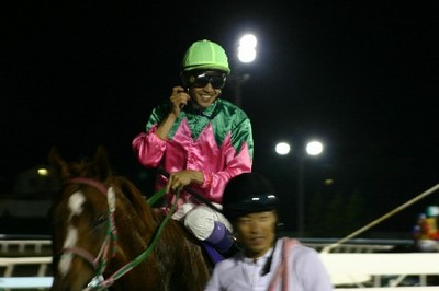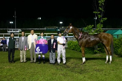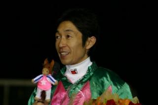 第12回 北海道スプリントカップ〔JpnⅢ〕武豊が3連覇!! 2008.06.19 6月19日、旭川競馬場で『第12回 北海道スプリントカップ(サラ 3歳以上オープン 1,000m)』が行われ、武豊騎手騎乗の1番人気 ジョイフルハートが59秒4のタイムで、武豊騎手は3連覇を達成! レースは好スタートから先頭に立ったジョイフルハートが直線に入って も力強い走りを見せ、後続馬を引き離して1着でゴール。2着にはホッカ イドウ競馬のダイワメンフィスが入りました。 写真 上:勝利直後の武豊騎手とジョイフルハート号 中:口取り写真 下:優勝インタビューを受ける武豊騎手