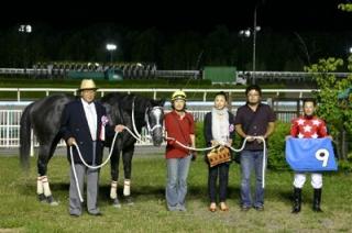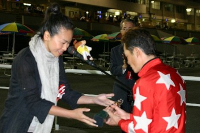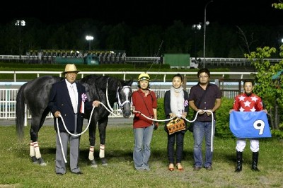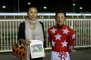 第12回 スタリオン競走表彰プレゼンター 2008.07.01 7月1日、旭川競馬場で第12回「スタリオン競走表彰プレゼンター」が行われまし た。 第12回目は「ソングオブウインド賞」で、千歳市のファンがプレゼンターを務め、 優勝馬デンコウアタックの桑原義光調教師(馬主代理)と五十嵐冬樹騎手にそれぞれ記 念品を贈呈しました。 また、プレゼンターには、(株)優駿から提供された『スタリオンブック』等が贈ら れました。 写真 上:優勝馬デンコウアタックと口取り写真 中:五十嵐冬樹騎手へ記念品贈呈 下:優勝馬関係者と記念写真