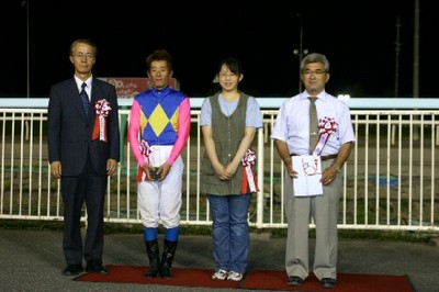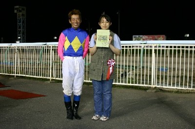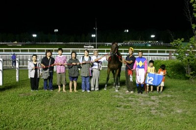 第21回 スタリオン競走表彰プレゼンター 2008.07.29 7月29日、旭川競馬場で第21回「スタリオン競走表彰プレゼンター」が行われました。 第21回目は「スパイキュール賞」で、旭川市のファンがプレゼンターを務め、優勝馬ニットウナデシコ号の原孝明調教師(馬主代理)と服部茂史騎手にそれぞれ記念品を贈呈しました。 また、プレゼンターには、(有)ビッグレッドファームから提供された『スタリオンブック』等が贈られました。 写真 上:優勝馬ニットウナデシコ号と口取り写真 中:全員で記念撮影 下:服部茂史騎手と記念写真