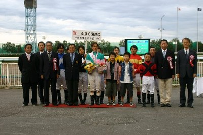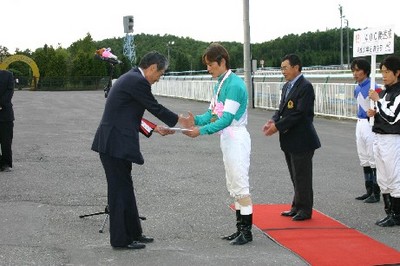 8月20日、旭川競馬場で8月19日に400勝を達成した川島雅人騎手(米川伸也厩舎)の表彰式が同競馬場スタンド正面で行われ、かけつけた多くのファンや関係者の祝福を受けました。