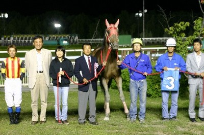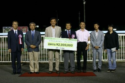 『アグネスタキオン・プレミアムⅠ』実施! 2008.08.20 8月20日、旭川競馬第10競走で、スタリオン・プレミアムシリーズ『アグネスタキオン・プレミアムⅠ』を実施しました。 このレースでは、服部茂史騎手騎乗のナサニエル号が勝利し、馬主・吉田俊介氏(代理)へ1着賞金200万円を贈呈しました。 写真 上:優勝馬ナサニエル号との口取り写真 下:賞金パネルを手に記念撮影