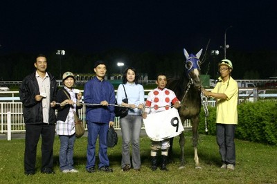 第12回 優勝馬との写真撮影体験! 2008.08.28 8月28日、旭川競馬場で「第12回 優勝馬との写真撮影体験」が行われ、 兵庫県から2名、神奈川県と東京都から4名のファンが写真撮影を行いました。 参加者は、第7レースの優勝馬フレキシブル号、優勝馬関係者と口取 り写真に参加しました。 写真 上:優勝馬フレキシブル号と口取り写真 下:坂下秀樹騎手と記念写真
