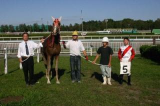 若松平調教師 900勝達成! 2008.09.09 9月9日、若松平調教師が、旭川競馬第1レースにスイートコンラッド号で出走し、 8、970戦目で通算900勝を達成しました。 写真 若松調教師に900勝をもたらしたスイートコンラッド号