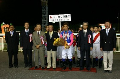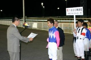 小国博行騎手 1800勝達成表彰式 2008.09.09 9月9日、旭川競馬場で9月4日に1800勝を達成した小国博行騎手(堂山芳則厩舎)の表彰式が同競馬場スタンド正面で行われ、かけつけた多くのファンや関係者の祝福を受けました。 表彰式終了後には、小国博行騎手から集まったファンに花束がプレゼントされました。 また、小嶋久輝騎手がプラカード持ちを務めてくれました。 写真 上:北海道馬主会から記念品の贈呈 下:参加者全員で記念写真