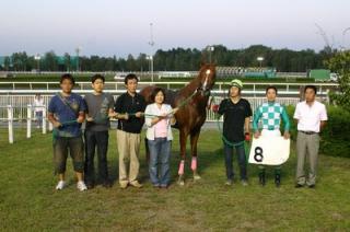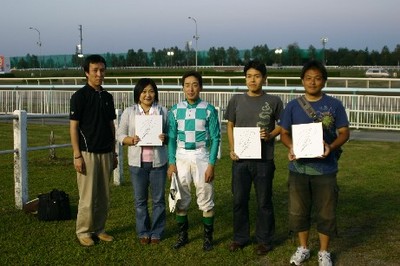 第12回 優勝馬との写真撮影体験! 2008.09.11 9月11日、旭川競馬場で「第12回 優勝馬との写真撮影体験」が行われ、 大阪府から1名、東京都から1名、札幌市から2名のファンが写真撮影を行いました。 参加者は、第7レースの優勝馬ミステリーハンター号、優勝馬関係者と口取 り写真に参加しました。 写真 上:優勝馬ミステリーハンター号と口取り写真 下:宮崎光行騎手と記念写真
