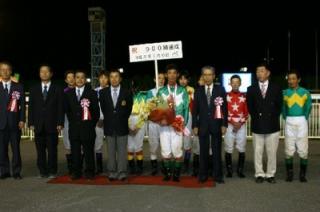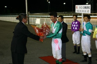 齊藤正弘騎手 900勝達成表彰式 2008.09.11 9月11日、旭川競馬場で9月10日に900勝を達成した齊藤正弘騎手(米川伸也厩舎)の表彰式が同競馬場スタンド正面で行われ、多くのファンや関係者の祝福を受けました。 表彰式終了後には、齊藤正弘騎手から集まったファンに花束がプレゼントされました。 また、川島雅人騎手がプラカード持ちを務めてくれました。 写真 上:北海道調騎会から花束の贈呈 下:参加者全員で記念写真