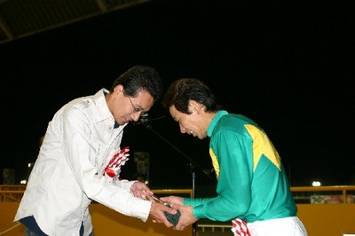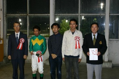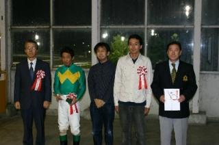 優勝馬マルカシリウス号の桧森調教師(馬主代理)と山口竜一騎手にそれぞれ記念品を贈呈しました。