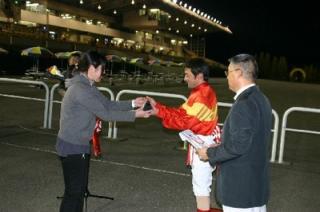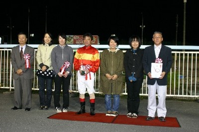 第39回 スタリオン競走表彰プレゼンター 2008.10.08 10月8日、旭川競馬場で第39回「スタリオン競走表彰プレゼンター」が行われ ました。 第39回目は「マイネルラヴ賞」で、中富良野町のファンがプレゼンターを務め、 優勝馬モエレソーブラッズ号の堂山芳則調教師(馬主代理)と井上俊彦騎手にそれぞれ記念品を贈呈しました。 また、プレゼンターには、(有)ビッグレッドファームから提供された『スタリオンブック』等が贈られました。 写真 上:井上騎手へ記念品贈呈 下:関係者と記念写真