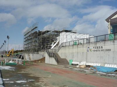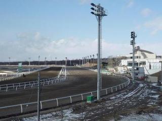 門別競馬場の照明施設や新スタンドの工事もほぼ順調な進捗状況。ホッカイドウ競馬が誇る今年の2歳馬たちも、足場の組まれたスタンドや工事車両・重機の中で逞しく馴致調教が進められており、古馬陣も含め活躍が期待されます。
