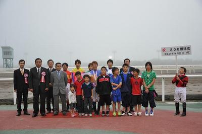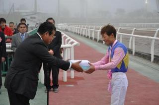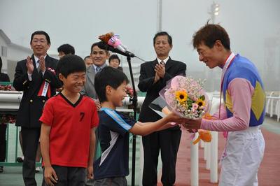 服部茂史騎手 800勝達成表彰式 2009.09.23 9月23日(水・祝)、門別競馬場で9月22日(火・祝)、第6レースメモリラヴ号に騎乗し通算800勝を達成した服部茂史騎手(楠克美厩舎)の表彰式がウイナーズサークルで行われ、多くのファンの方々や関係者の皆様の祝福をいただきました。 表彰式終了後には、服部茂史騎手から集まったファンに花束がプレゼントされました。 (プラカード 黒澤愛斗騎手)