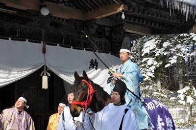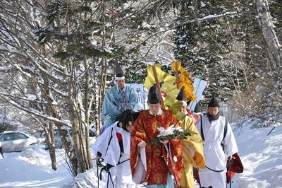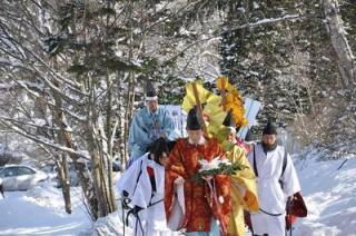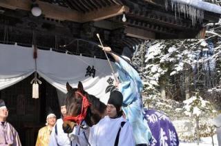 平取町の義経神社「初午祭」の行事者を若松平調教師が務める 2010.02.01 本日(2月1日)、平取町の義経神社で愛馬の息災と必勝祈願の儀式「初午祭」が行われ「初午祭矢刺しの神事」ではホッカイドウ競馬の若松平調教師が「行事者」を務め、鬼門とされる南西の方向へ空に向かって矢を3本放ちました。