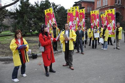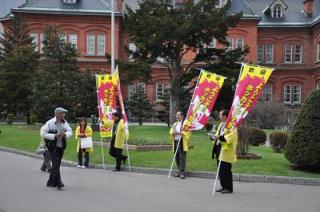 4月22日(木)、ホッカイドウ競馬開幕にむけて、日高町の商工会やトレセン町内会婦人部のメンバーで構成された「ホッカイドウ競馬を応援する会(半田会長ほか11名)」が、道庁赤レンガ前でホッカイドウ競馬のグランシャリオナイター開幕を、告知ティッシュの配付をしながらPRしました。