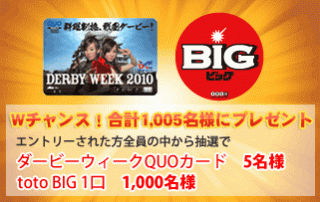 またWチャンスとして、楽天totoの楽天競馬店オープンを記念して、エントリーされた方に抽選で5名様にダービーウイークQUOカードを、1,000名様にBIG 1口をプレゼントいたします!