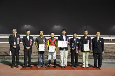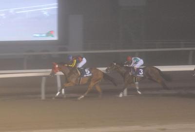 本日6日(火)、門別競馬場では、日本で一番早い2歳馬による重賞、第35回栄冠賞(H2)〔マンハッタンカフェ賞〕」が開催され、佐々木国明騎手騎乗の単勝1番人気クラーベセクレタ号が、2着馬のクイックスター号に1馬身1/2差をつけて優勝しました(タイム1.14.1)。