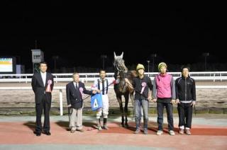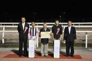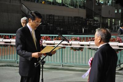 また、協賛競走の表彰式では、浦河町長 池田 拓様より優勝馬ビコーオラクル号の関係者に副賞が贈られました。