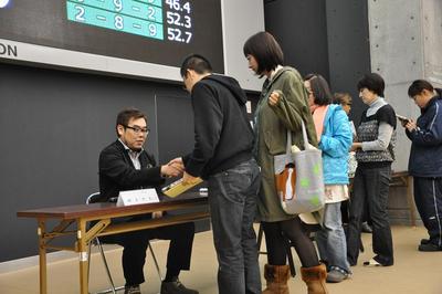 競馬漫画 「スピーディワンダー」発売記念イベントを開催 2010.10.21 本日より全国の書店で発売開始となったヤングチャンピオンで連載中の本格競馬漫画「スピーディワンダー」の単行本1巻発売記念イベントをポラリス☆ドームで開催しました。限定50冊の単行本を購入したお客さまは、原作者である綱本将也さんのサインを頂き、大変喜んでいた様子でした。 また、協賛競走 第10競走「スピーディワンダー特別」のパドック解説にも出演して頂き、表彰式のプレゼンターも務めて頂きました。