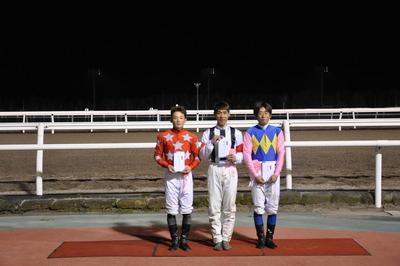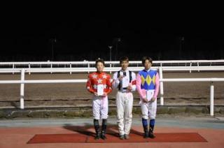 日高町建設協会杯リーディングジョッキー競走Ⅰ 日高町商工会杯リーディングジョッキー競走Ⅱの結果 2011.05.03 昨年度のホッカイドウ競馬リーディング上位騎手によって優勝者を決めるリーディングジョッキー競走。今年も2レースの総合得点で争われました。 結果は、第8レース,第9レースを優勝した小嶋久輝騎手が総合40ポイントで優勝しました。第2位は、第8レース,第9レースを2着となった服部茂史騎手が30ポイントを獲得。第3位は、第8レース,第9レースを4着となった五十嵐冬樹騎手が22ポイントを獲得しました。