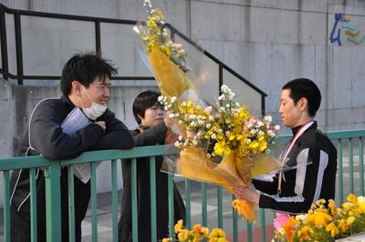 岩橋 勇二騎手 200勝達成表彰式 2011.06.15 6月8日(水)、第12レース サンレイレーザー号に騎乗し、通算200達成した岩橋勇二騎手(田中淳司厩舎)の表彰式が6月15日(水)第9競走終了後、ウイナーズサークルで行われ、ファンの方々や関係者の皆様の祝福をいただきました。