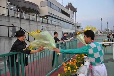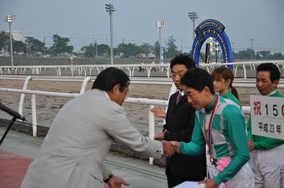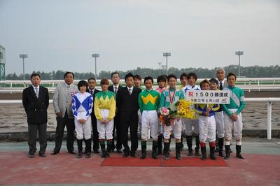 6月23日(木)第7レースコパノワーニング号に騎乗し、地方・中央通算1,500達成した宮崎光行騎手(松本隆宏厩舎)の表彰式が6月29日(水)第8競走終了後、ウイナーズサークルで行われ、ファンの方々や関係者の皆様の祝福をいただきました。