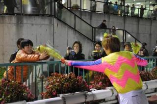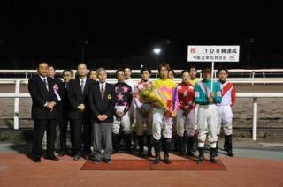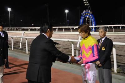 10月18日(火)第8レース シンボリドンナー号に騎乗し、地方・中央通算100達成した伊藤千尋騎手(伊藤靖則厩舎)の表彰式が第10競走終了後、ウイナーズサークルで行われました。