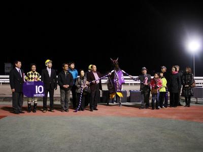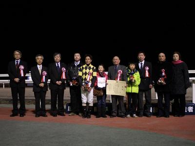 11月17日(木)、今年のホッカイドウ競馬を締めくくる大一番、第54回 道営記念[ゼンノロブロイ賞]が行われ、吉田稔騎手騎乗のショウリダバンザイ号(林和弘厩舎)が2着リフレックス号に4馬身差をつけて優勝しました(優勝タイム2 .06.8)。馬主 林正夫氏は、ホッカイドウ競馬の元調教師で、騎手時代に道営記念を3度、調教師時代に2度、そして今年は馬主としての道営記念制覇となりました。