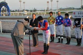 先週の6月21日(木)に地方・中央通算900勝を達成した馬渕 繁治騎手(佐藤 英明厩舎)の表彰式が本日の第8競走終了後、ウイナーズサークルで行われました。