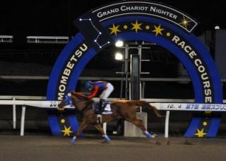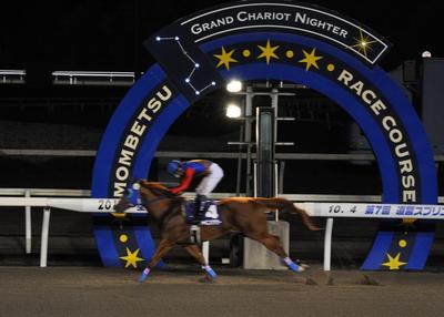 10月4日(木)、東京スポーツ杯 第7回道営スプリント(H2)[ダノンシャンティ賞]が行われ、桑村 真明騎手鞍上のシャイニングアワー号が2着プリティゴールド号に4馬身差をつけて優勝しました(タイム1.12.1)。