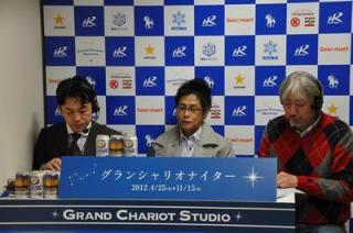 本日のグランシャリオスタジオ(11月15日) 2012.11.15 第12競走 道営記念のパドック解説ゲストとして、昨年の道営記念をショウリダバンザイ号で優勝した吉田稔氏が出演。昨年優勝したときのエピソードや道営記念の注目馬などを紹介してくれました。